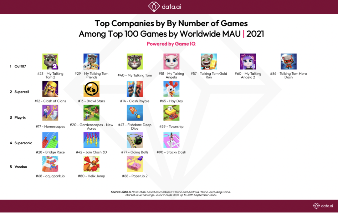 值得注意的是,data.ai的数据显示,汤姆猫家族IP系列游戏不仅在全球游戏下载榜单表现优异,系列产品在月活跃用户(MAU)数据上也占有绝对优势。在2013年到2022年的十年间,汤姆猫家族IP系列中的多款游戏产品稳居全球游戏MAU百强榜单,与此同时,得益于精品产品的长线运营和新产品的扩充,跻身全球游戏MAU百强榜单中的汤姆猫家族IP游戏数量保持着稳步增长态势,2021年,汤姆猫家族IP中共有7款游戏入围MAU百强榜单,再度坐实用户根基深厚、内容品质优异的游戏IP头部地位。